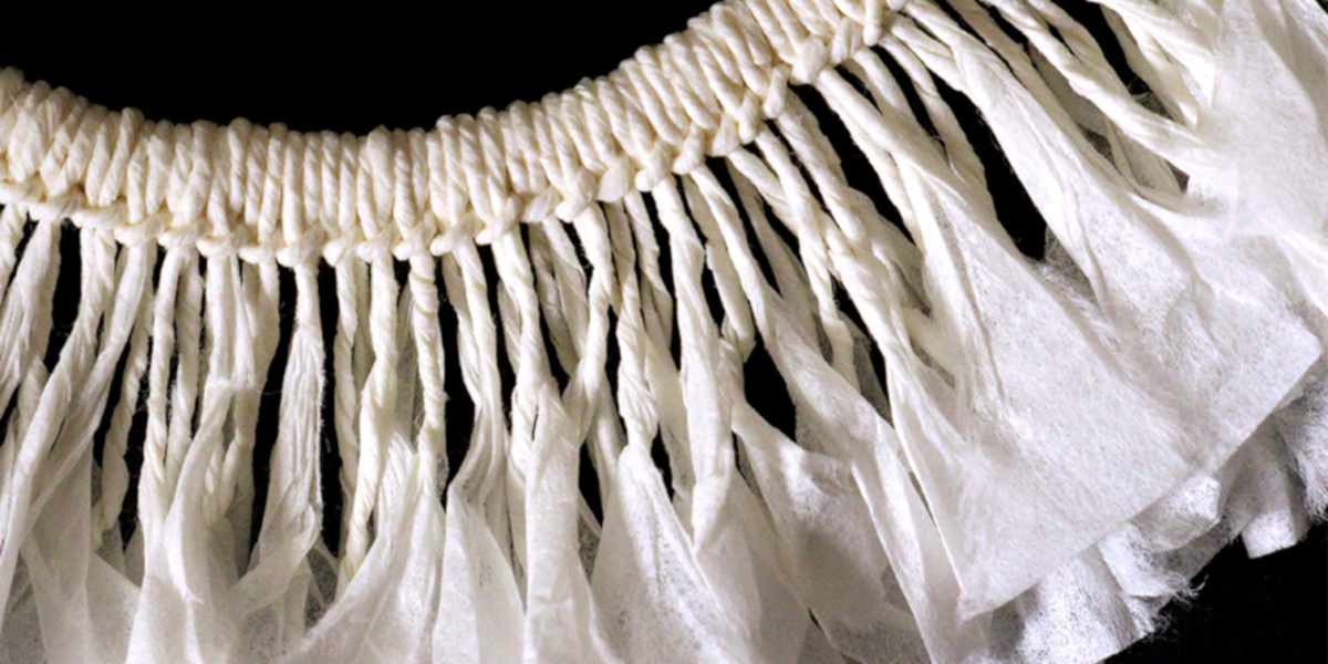 This piece of jewellery is created by a paper-based textile technique called “shifu”. It consists of weaving threads of paper, obtained by cutting then twisting paper strips.