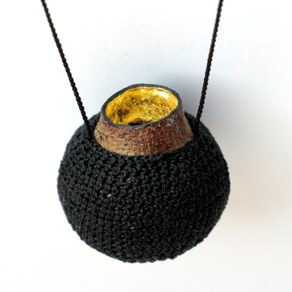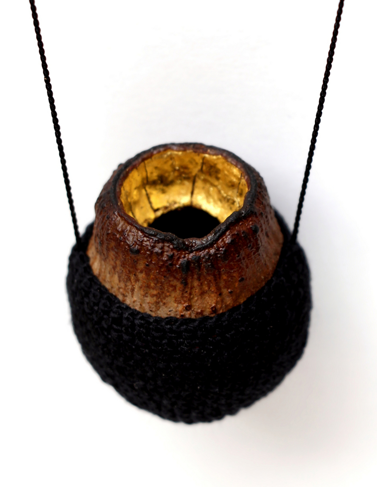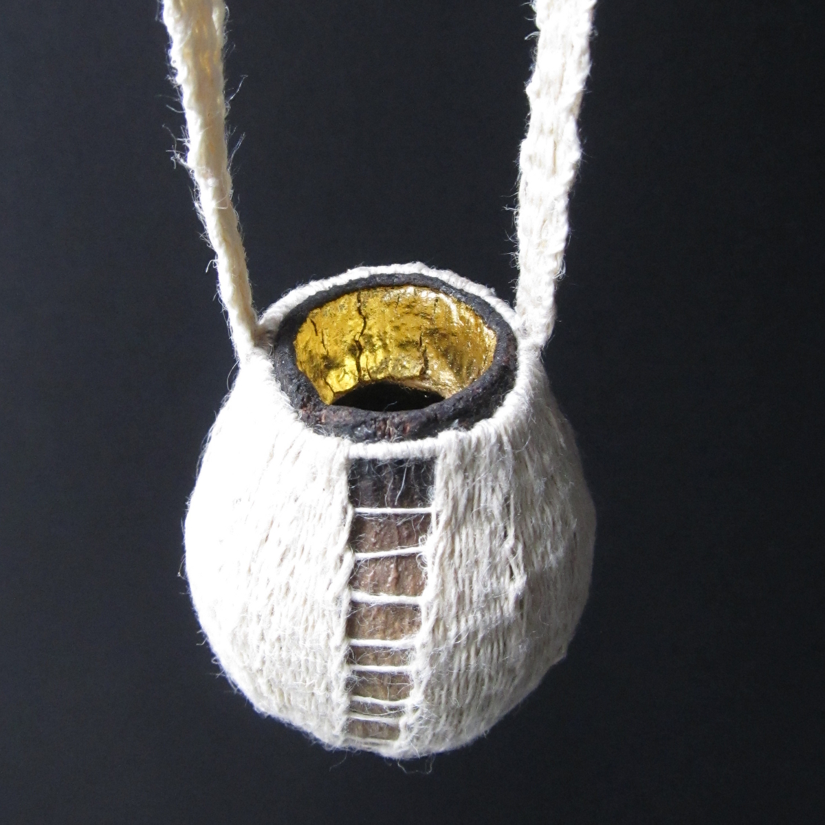 Eucalyptus pods, silk/linen thread, with gold leaf