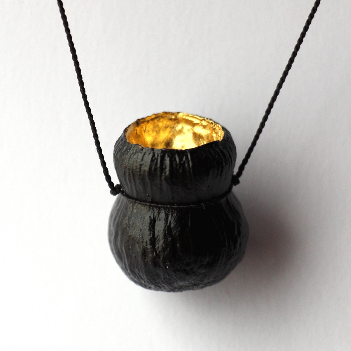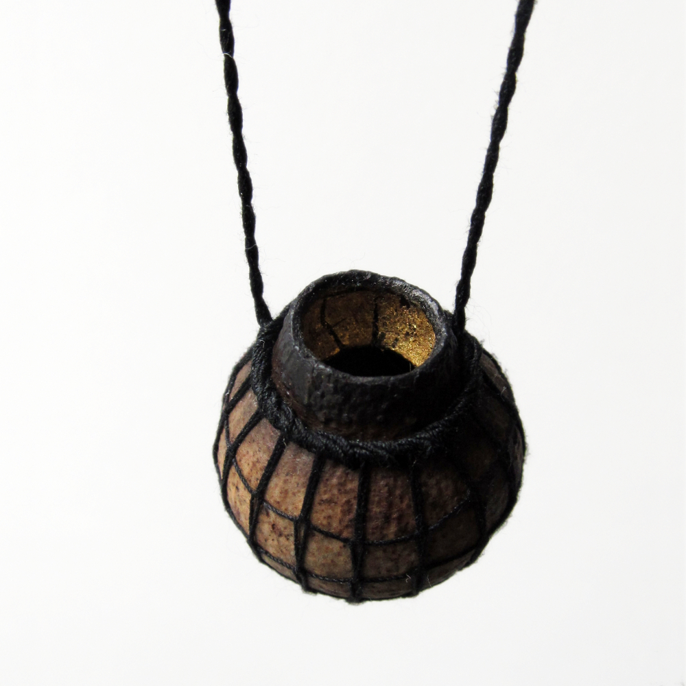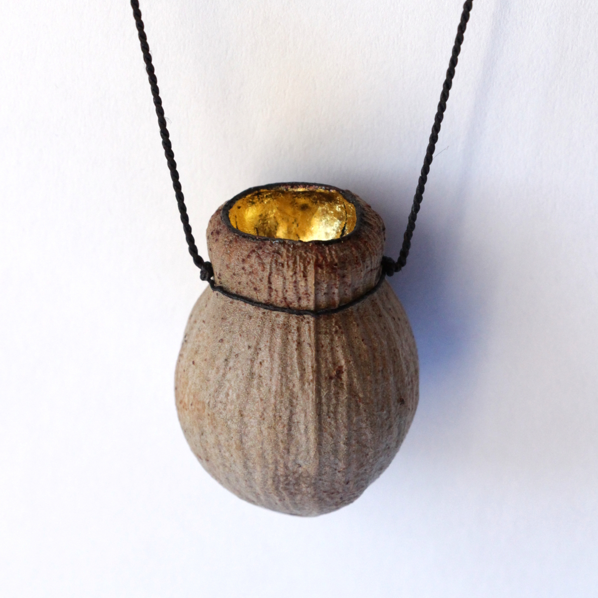 Eucalyptus pods, silk/linen thread, with gold leaf