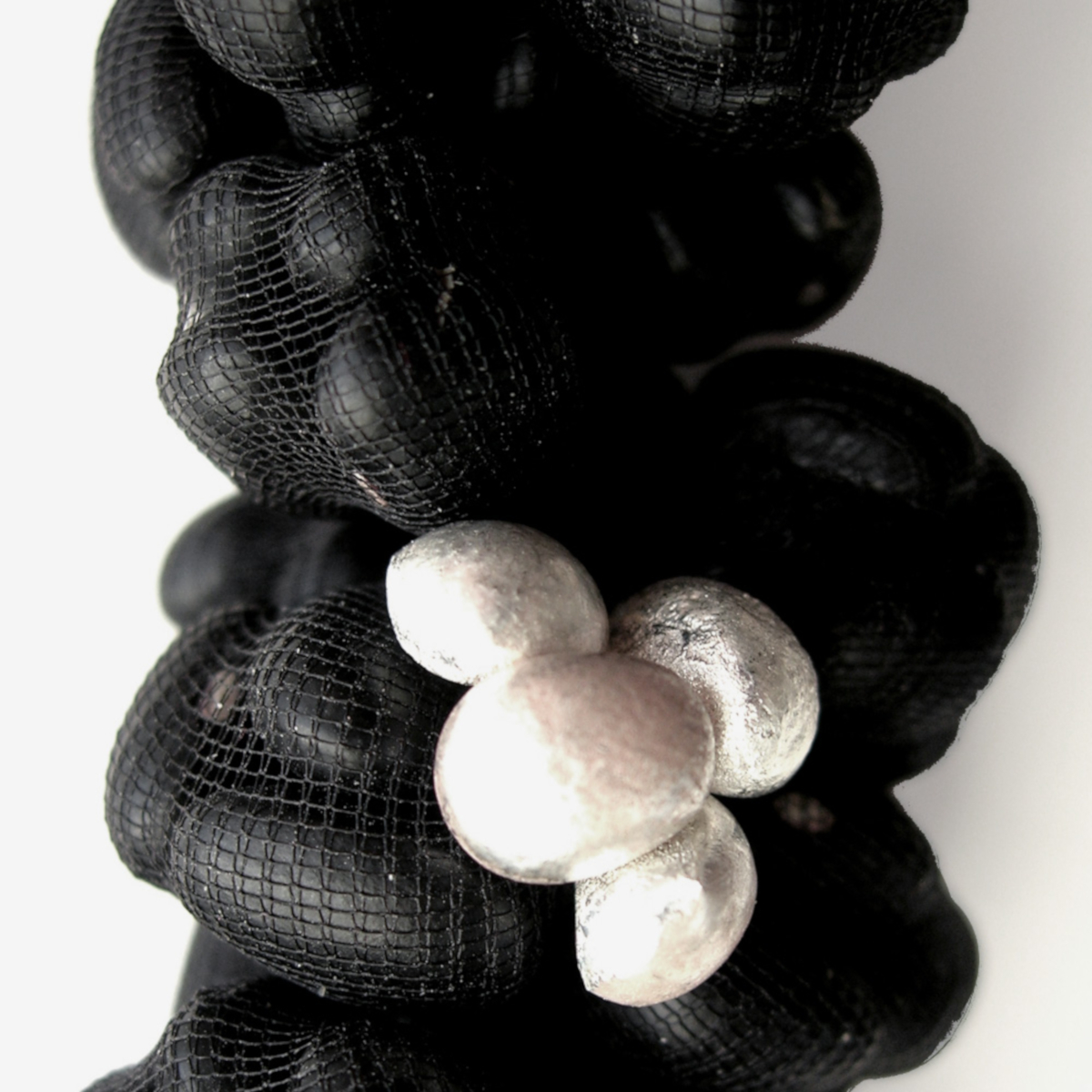 Creator of organic jewellery, I have been reflecting for some years on the definition of the jewellery, its meaning, usage and possible transformations. These pieces of jewellery have been created by hand, with an original assembly technique using textiles. This enables them to retain their life force, through respect for the material and the spirit within. The technique used is reversible, which allows the jewellery’s elements to continue to exist after having been worn. The promise of a second life is contained within this jewellery.