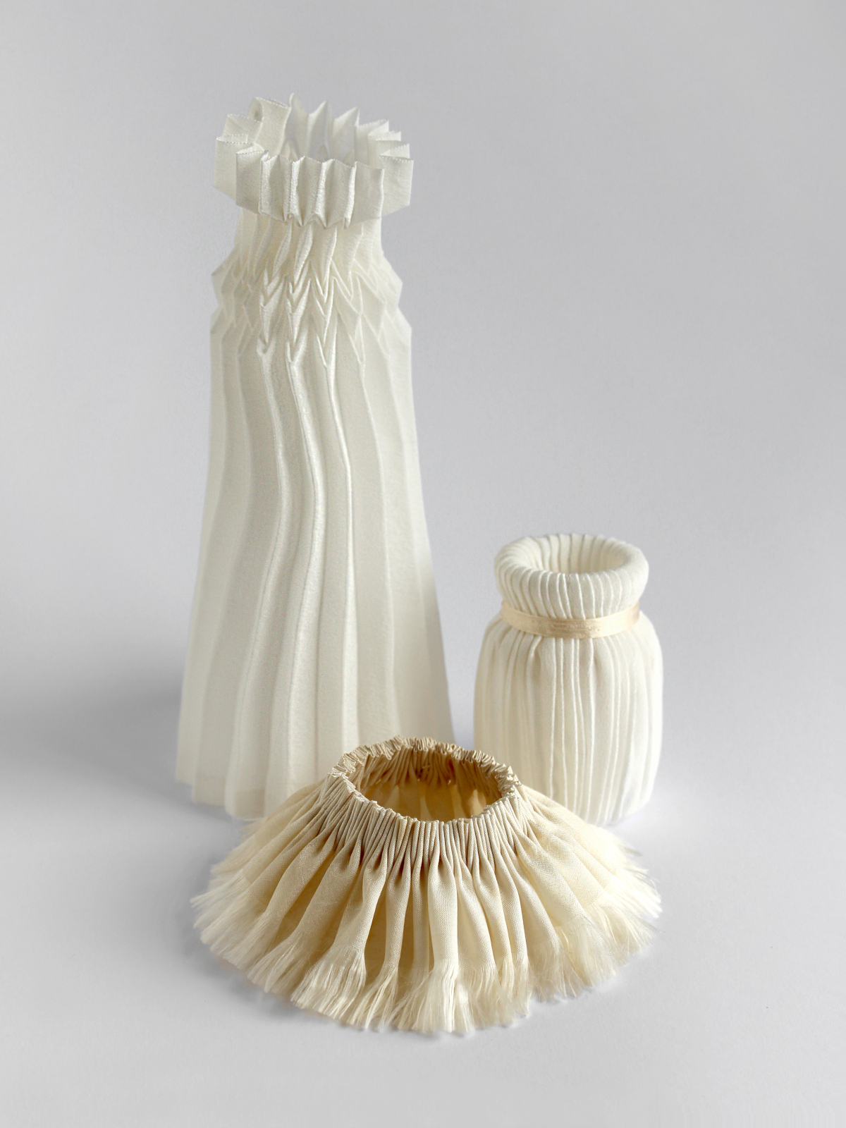 I chose silk for its translucence and amazing draping properties that explore tridimensionality by using gathers, pleats and smocks.